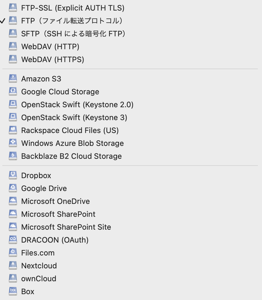 FTP、FTP-SSL、SFTP、WebDAVはもちろんのこと、DropBoxやGoogleDriveなどとも接続することができます。